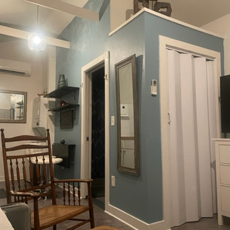 In the end, the client got exactly what she requested, with a modern cool and silver tone guest studio, that's comfortable feeling but designed with clean lines and a contrasting blue accent wall.